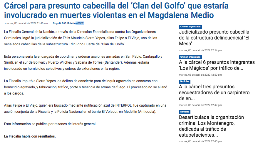 En las últimas horas la Fiscalía General de la Nación, por medio de su boletín 43352 confirmaron que la Dirección Especializada contra las Organizaciones Criminales, logró co la judicialización de Mauricio Sierra Yepes, alias ‘El Viejo’, quién sería uno de los presuntos cabecillas de la subestructura Erlin Pino Duarte del ‘Clan del Golfo’.