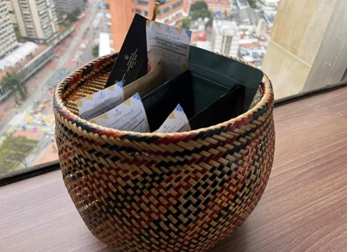 La cesta de regalo está compuesta por café y chocolates tipo exportación elaborados por 18.000 familias cacaoteras y 2.300 caficultoras vinculadas desde el comienzo de este gobierno a programas de sustitución voluntaria de cultivos ilícitos.